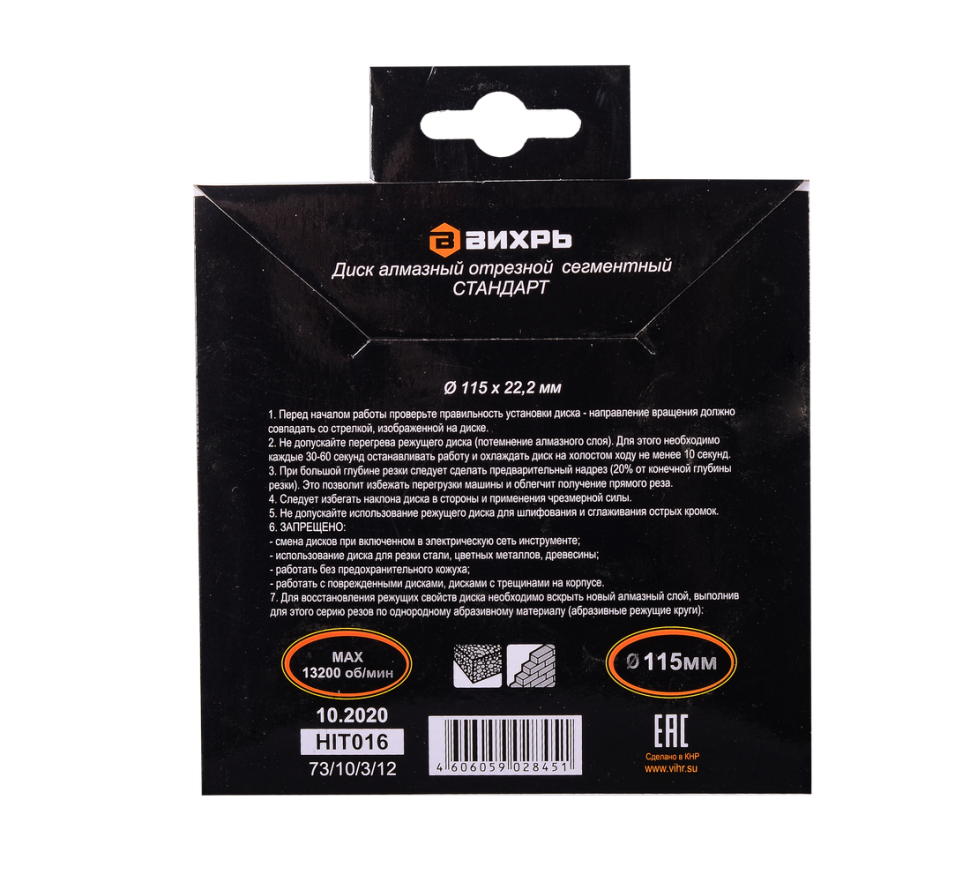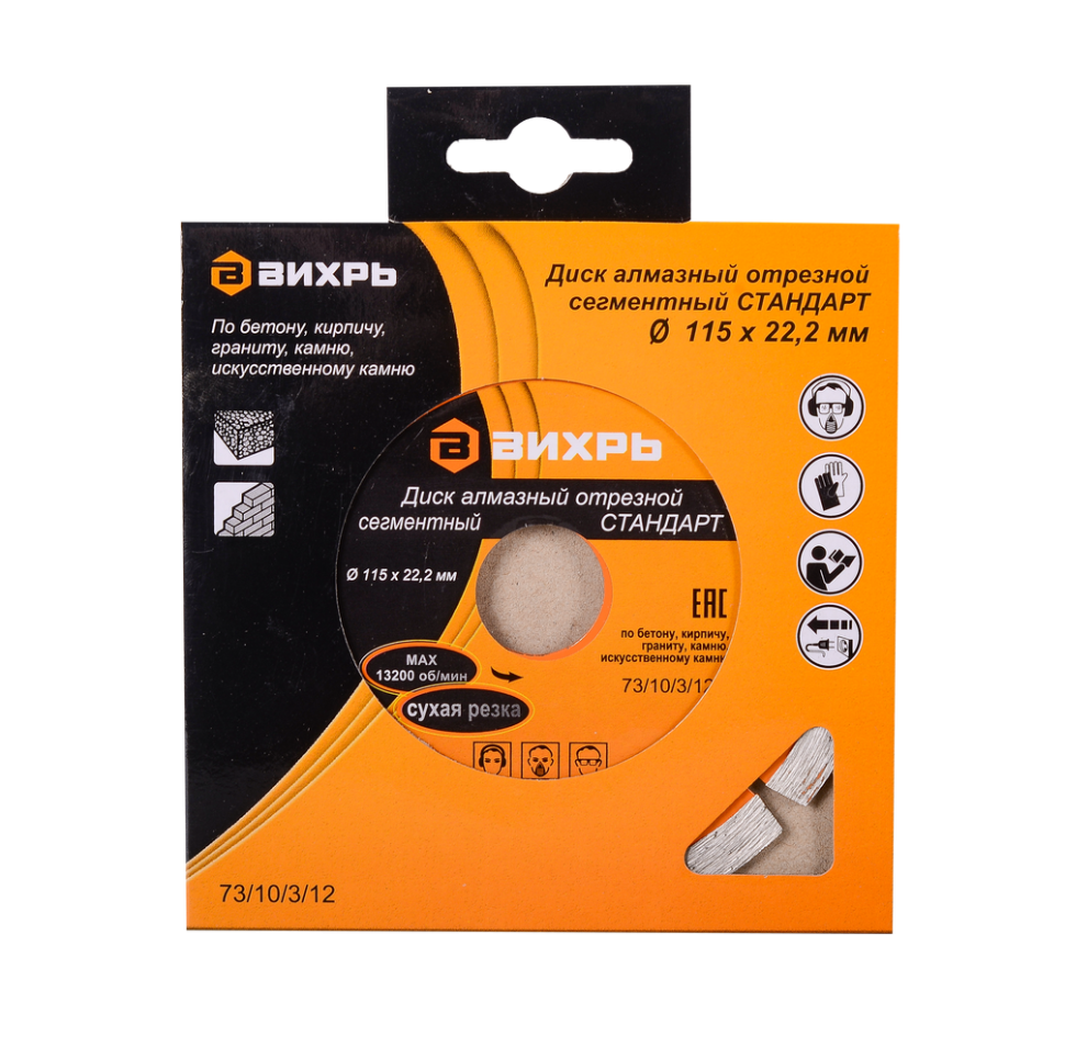 - Диск алмазный отрезной сегментный СТАНДАРТ Вихрь, 115х22,2 мм, сухая резка