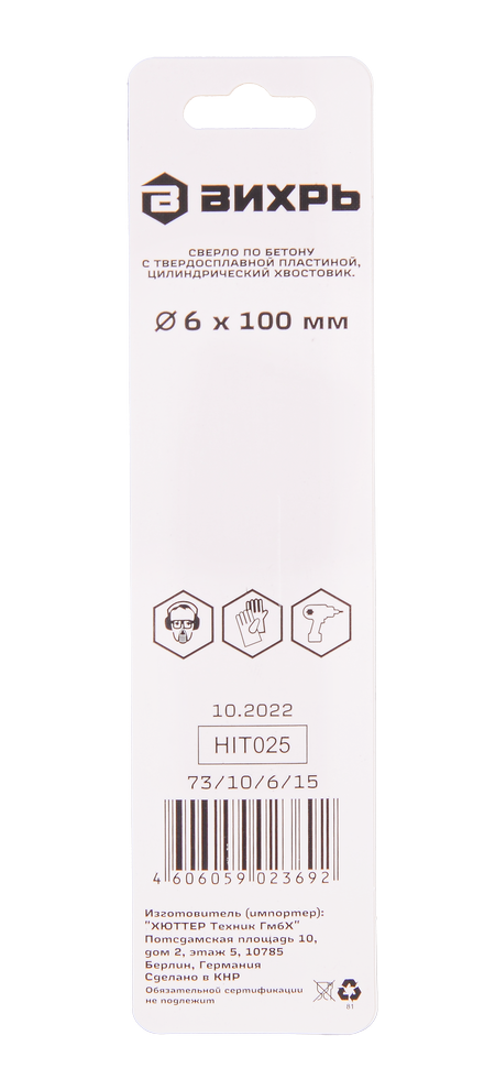 - Сверло по бетону ВИХРЬ 6x100