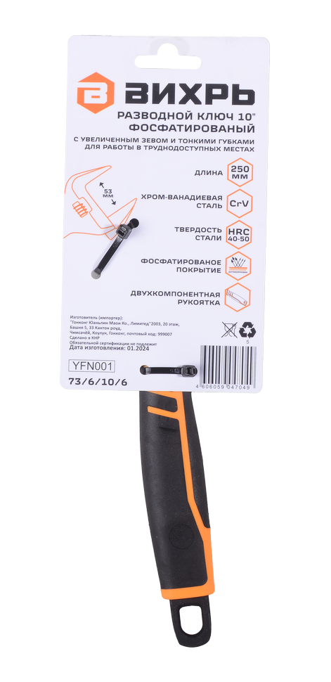 - Разводной ключ с тонкими губками, фосфатированный, 250 мм, Вихрь