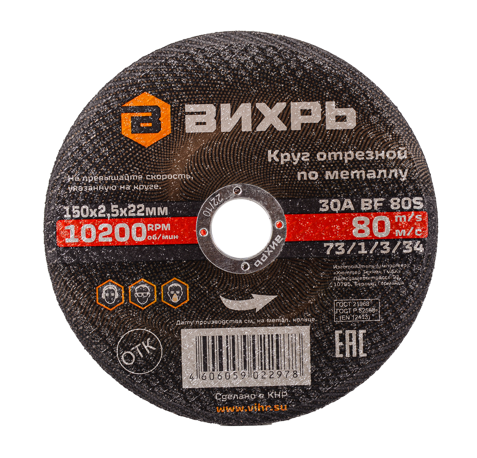 - Круг отрезной по металлу ВИХРЬ 150х2,5х22 мм