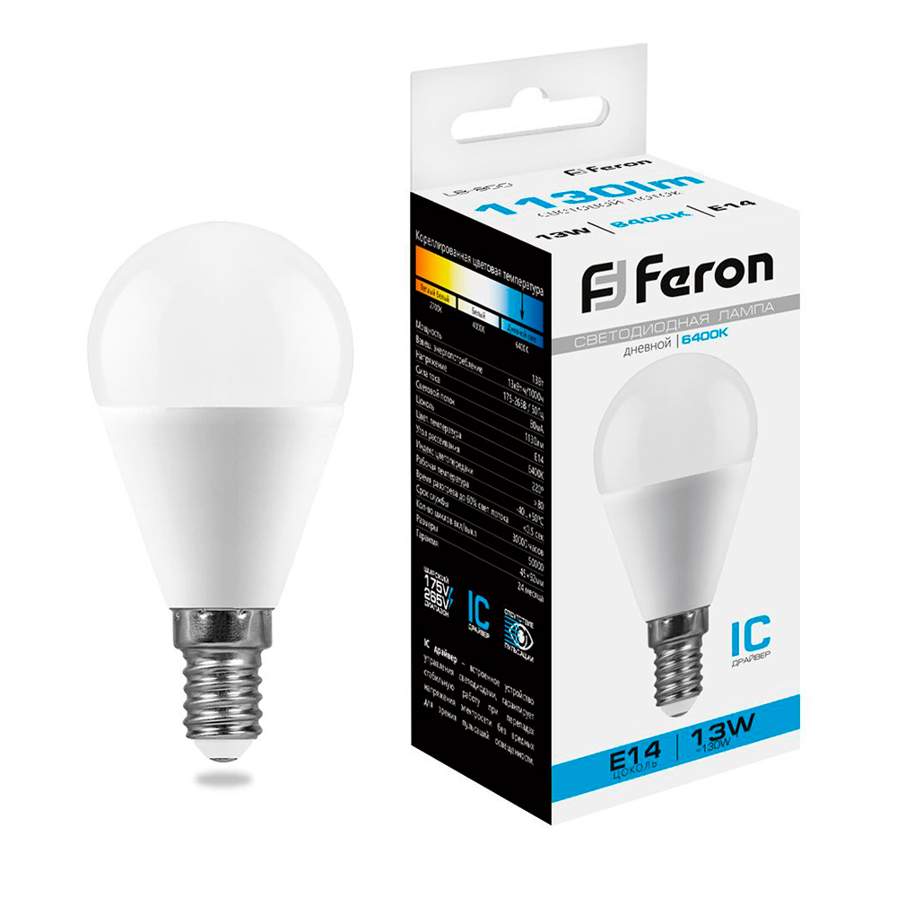 - Лампа светодиодная Feron LB-950 Шарик E14 13W 175-265V 6400K