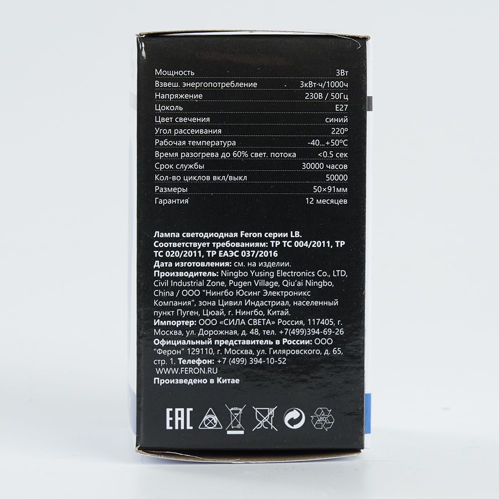 - Лампа светодиодная Feron LB-375 E27 3W матовая 230V синяя