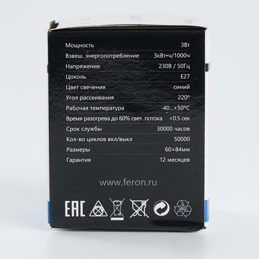 - Лампа светодиодная Feron LB-371 Шар матовый E27 3W 230V синий
