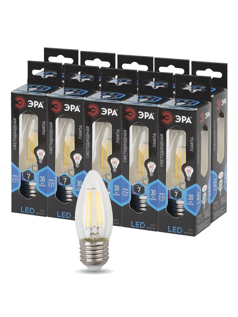- Лампа светодиодная ЭРА F-LED B35-7W-840-E27 7Вт филамент свеча нейтральный белый свет Е27