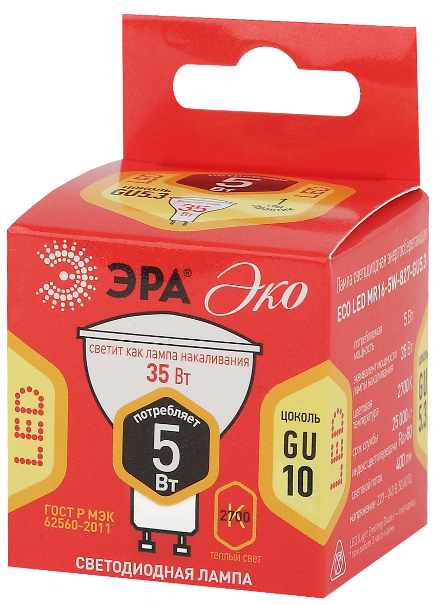 - Лампа светодиодная ЭРА RED LINE ECO LED MR16-5W-827-GU10 5Вт софит теплый белый свет GU10