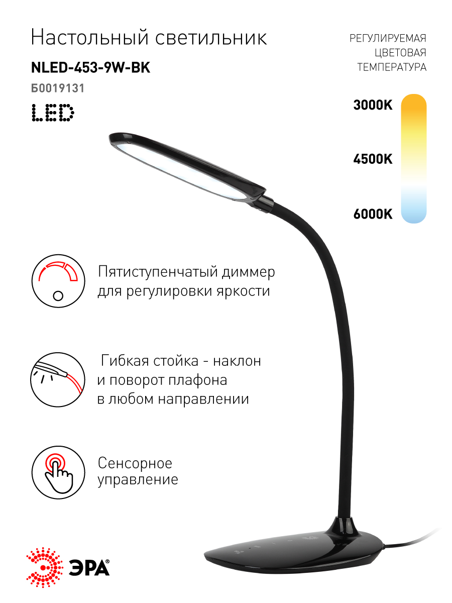 - Настольный светильник ЭРА NLED-453-9W-BK светодиодный черный